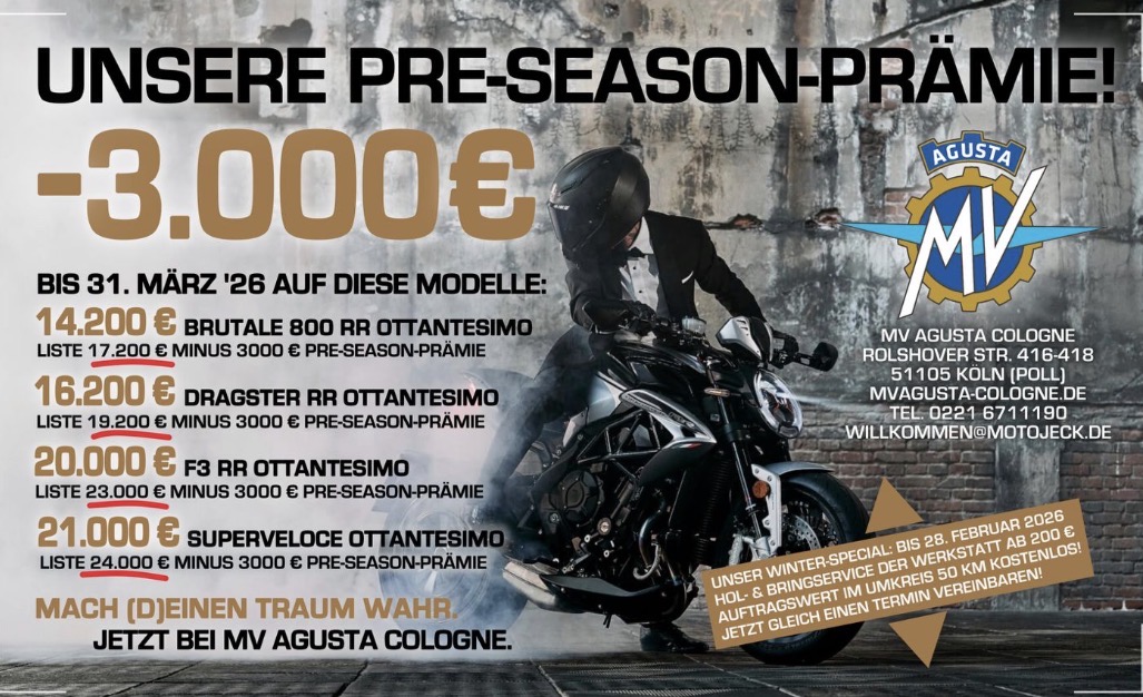 Und das Beste: Bei uns findest Du ständig über 50 sofort verfügbare Neufahrzeuge am Lager! Komm vorbei und entdecke die Faszination von MV Agusta!