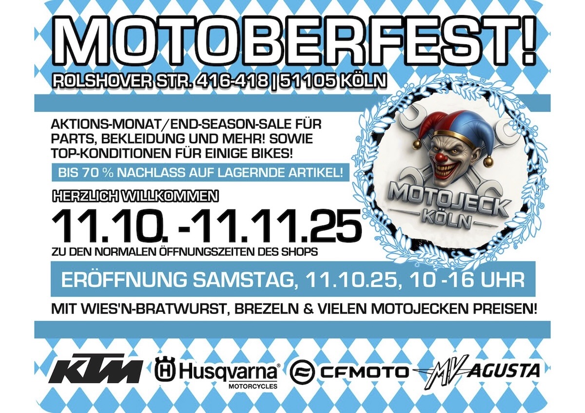 Ob für den kurzfristigen Urlaubscheck, mit einem kleinen Defekt, zu Inspektion und/oder TüV-Termin, um die neuen Modelle 2025 zu sehen und vielleicht zur Probe zu fahren, einfach so auf eine Tasse Kaffee … wir freuen uns immer, Euch bei uns im Shop bzw. der Werkstatt von Motojeck begrüßen zu dürfen. Und das ein oder andere Angebot gibt’s eh stets zu entdecken. Also, keine Hemmungen – und auf geht’s zu unserem kleinen Motojeck Biker-Treff. Herzlich Willkommen!